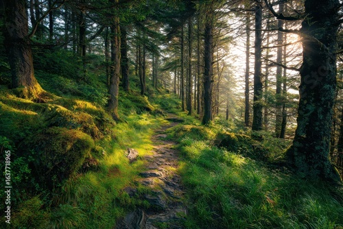 Lush green pathway through dense forest sunlight during golden hour in a serene natural setting