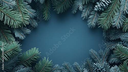 Lush green pine branches and cones arranged in a circular pattern against a deep blue background