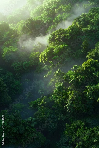 Lush Green Rainforest Canopy Enveloped in Morning Mist