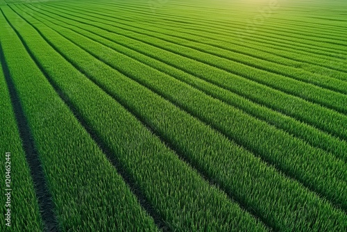 Lush Green Rice Field Displaying Perfectly Aligned Rows of Vibrant Rice Plants Under a Soft Evening Glow with a Clear Sky Background Capturing Nature's Beauty