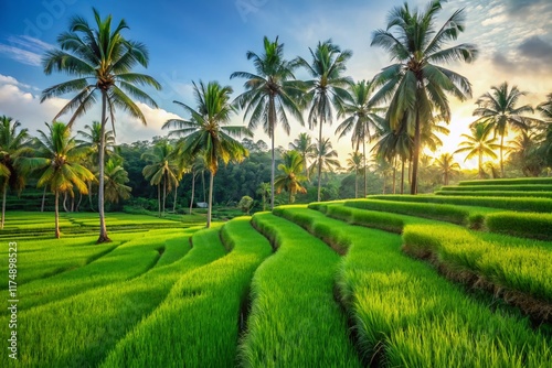 Lush Green Rice Paddy Field with Coconut Trees - Beautiful Asian Landscape Stock Photo