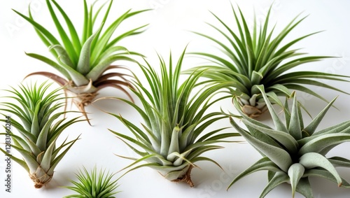 Lush green tillandsia air plants arranged artistically on a clean white background showcasing their unique textures and shapes.