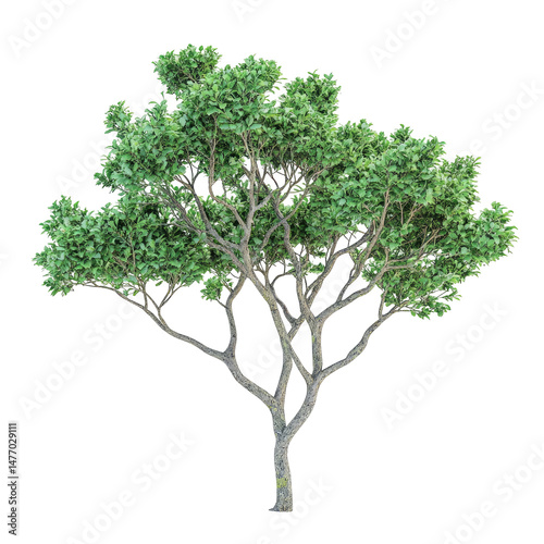 Lush green tree against a black background. Full and vibrant foliage. Strong, intricate branches. Healthy growth
