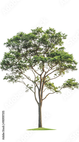 Lush green tree with a thick trunk and broad canopy, isolated on a white background. transparent background