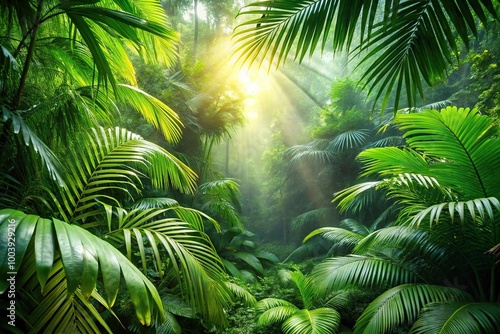 Lush green tropical jungle with sunlight filtering through the leaves reflected