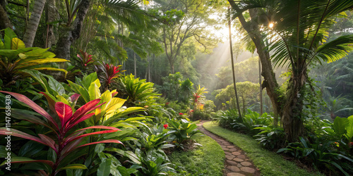 Lush greenery and vibrant flora create serene wilderness path through jungle, illuminated by soft sunlight filtering through trees, inviting exploration and tranquility