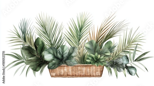 Lush Greenery Arrangement in Woven Basket with Tropical Leaves