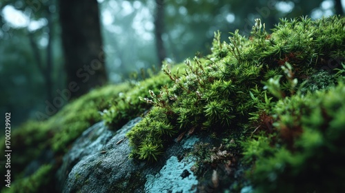 Lush moss-covered stone, creating a natural texture within a misty woodland