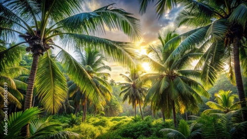 Lush Palm Tree Jungle Sketch at Dawn - Tranquil Morning Landscape with Copy Space for Creative Projects, Nature Illustrations, and Tropical Themes