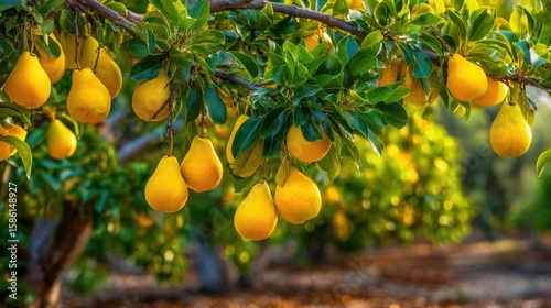 Lush Pear Tree with Bright Yellow Fruit Growing in a Sunny Orchard Scene.