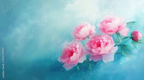 Lush pink peonies nestled against a gentle blue backdrop, enhanced by a dreamy blurred effect, creating a serene floral scene.
