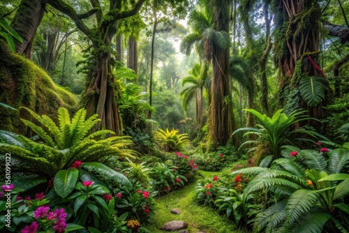 Lush Rainforest Path A Serene Walk Through Vibrant Green Flora and Ancient Trees, Sunlight Filtering Through Canopy