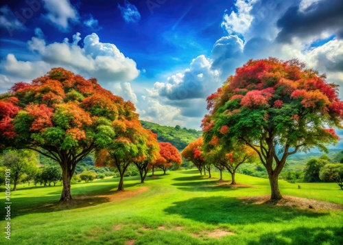 Lush shoemack trees enveloped by vibrant greenery create a peaceful, natural landscape, where tranquility and beauty coexist in harmonious splendor. Nature's serenity is captivating.