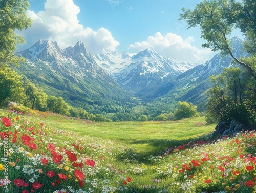 lush spring landscape bursting with vibrant wildflowers in a sunny green meadow beneath a clear azure sky. the scene is cheerful and inviting, evoking the beauty of nature