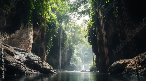 Lush, tranquil gorge with a flowing stream. Sunlight filters through a dense jungle canopy, creating a mystical atmosphere within the narrow canyon