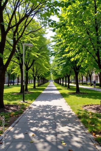 Lush Tree-Lined Pathway in Bright Daylight with Sunlight Filtering Through Leaves