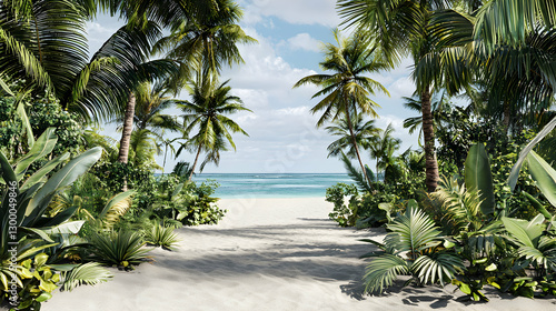 Lush Tropical Beach Scene with Palm Trees and Sunny Sky