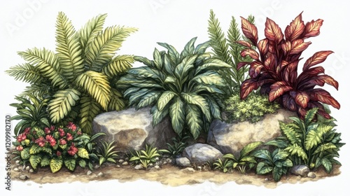 Lush Tropical Plants and Ferns with Rocks for Nature Background Art