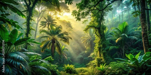Lush Tropical Rainforest at Dawn Sunlight Beams Illuminate Vibrant Greenery, Palm Trees, and Dense Foliage, Creating a Serene and Tranquil Atmosphere