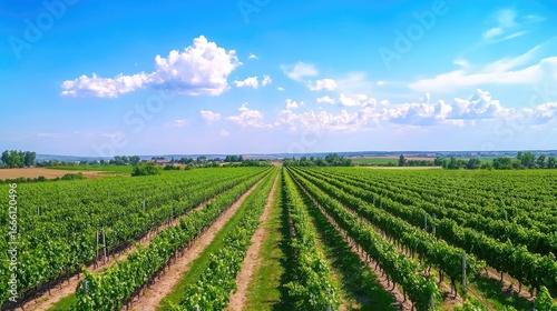 Lush Vineyard Landscape with Rows of Grape Vines Under a Bright Blue Sky and Fluffy Clouds