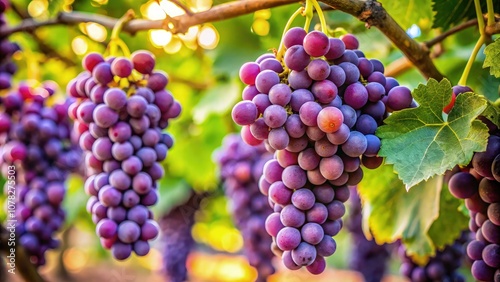 Lush vineyard scene with ripe clusters of deep purple and blue grapes, glistening under golden sunlight. Warm sunlight filters through vibrant green leaves, creating a dappled light effect