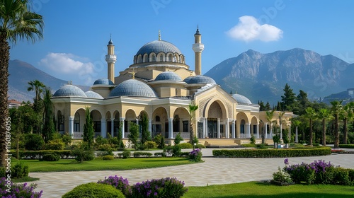 luxurious and magnificent mosque building, with a large and beautiful garden, with beautiful mountain views