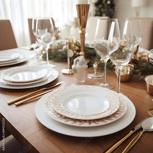 Luxurious Dining Table Set-up featuring White Ceramic Plates, Silverware, Crystal Glassware, and Floral Centrepiece