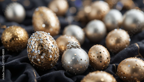 Luxurious easter eggs, painted in gold and silver, resting on a dark fabric, adorned with delicate golden glitter, creating a sophisticated and festive atmosphere.