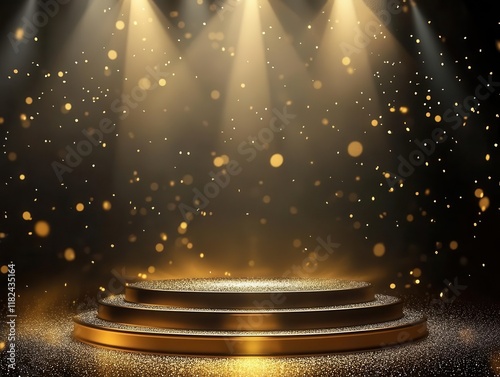 luxurious golden stage podium with dramatic spotlight effects and elegant glowing particles for premium product presentation