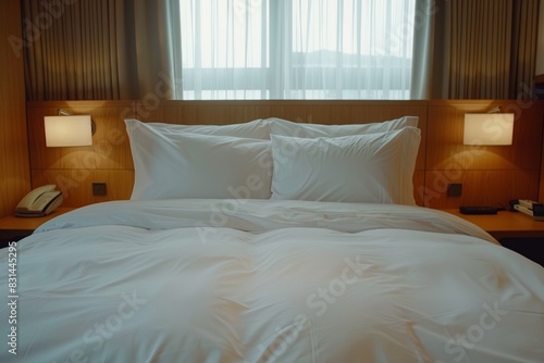 Luxurious hotel room with modern decor, comfortable bed, and large windows offering city views, creating a stylish and relaxing atmosphere