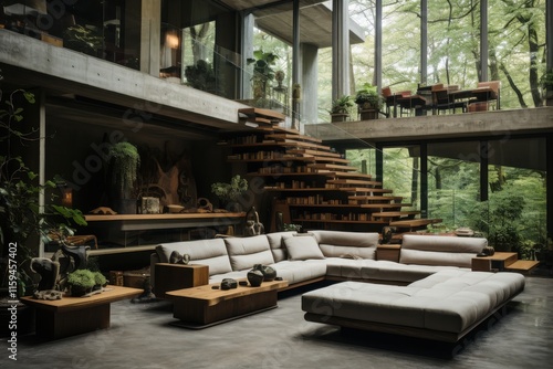 Luxurious Modern Living Room with Open Glass Walls and Wooden Staircase Surrounded by Forest Views, Contemporary Interior Design, Ai Generation