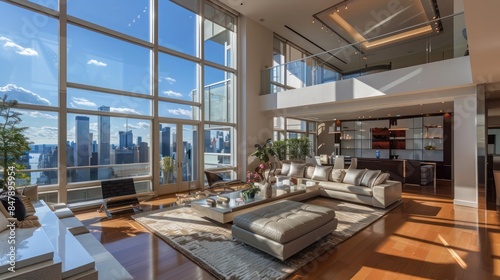 luxurious penthouse with an open-concept design, expansive windows, and city views