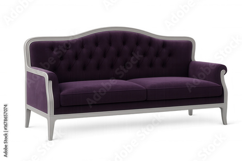 Luxurious purple chesterfield sofa with white wooden frame isolated on transparent background, perfect for interior design projects