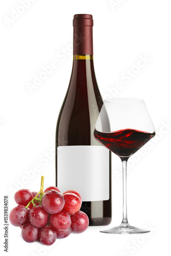 Luxurious red wine in bottle with blank label, glass and grapes isolated on white