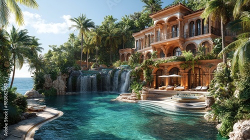 Luxurious villa overlooking the ocean with private waterfall and infinity pool