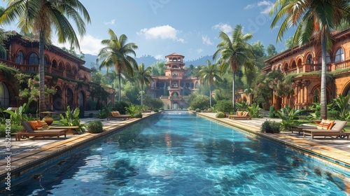 Luxurious villa with a large swimming pool and sun loungers, set in a picturesque countryside under a clear blue sky.