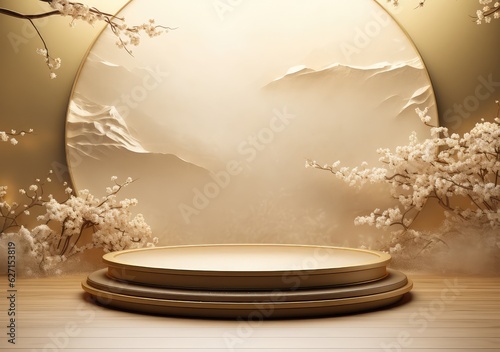 Luxury background with product display podium with silk and japanes background. gold liquid elements decoration. AI Generative.