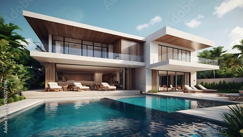 Luxury beach house with sea view swimming pool in modern design, Vacation home for big family. 3d rendering of building and swimming pool