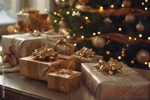 Luxury Christmas Gifts Displayed on Table in Beige Room with Christmas Tree, Close-Up View