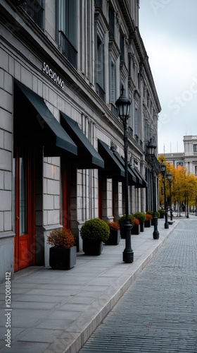 Luxury fashion store features sophisticated black awnings with striking red details in a stylish neighborhood