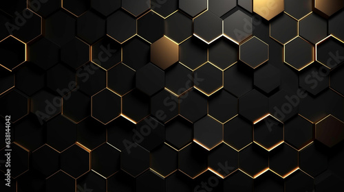Luxury hexagonal abstract black metal background with golden light lines. Dark 3d geometric texture illustration. Bright grid pattern.