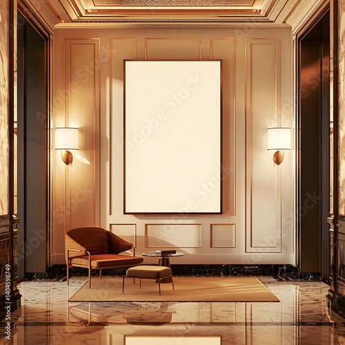 Luxury living room interior with a large blank canvas mockup, perfect for showcasing artwork or advertisements. A plush armchair and ottoman sit invitingly before the artwork in this elegant space.