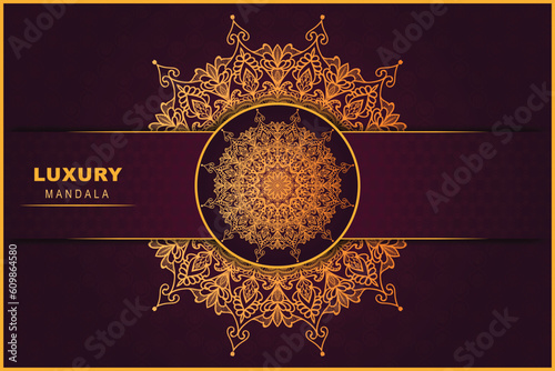 Luxury mandala texture decor design with gold and dark red color, flower frame background template