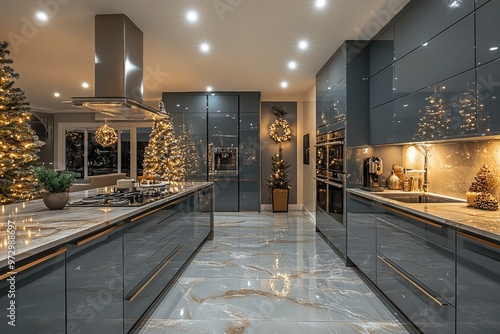 Luxury modern kitchen interior, with kitchen island beautifully decorated for Christmas holidays