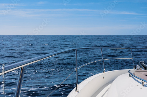 Luxury motor yacht in the azure Mediterranean sea at full speed.Expensive yacht.