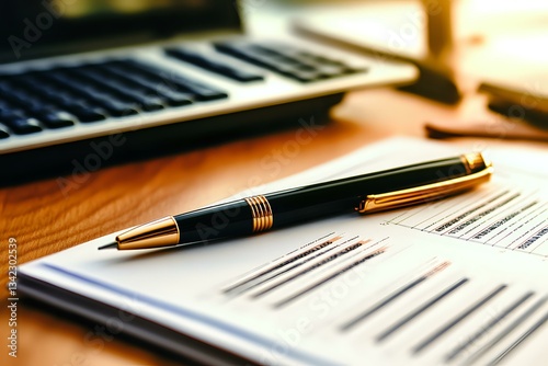 Luxury pen on business contract papers with calculator in background, warm lighting creates professional atmosphere for signing documents and agreements.