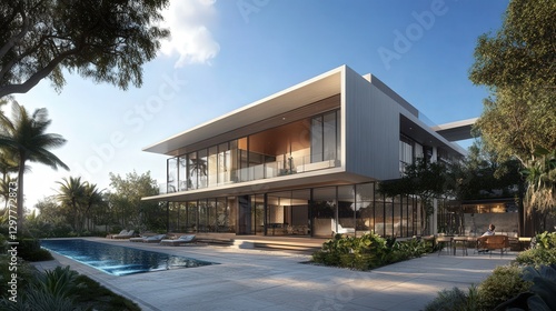 luxury residential building with a minimalist design, incorporating open floor plans, high ceilings, and smart home technology