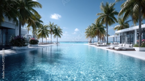 Luxury Resort Swimming Pool With Palm Trees Under Bright Sky Tranquil Turquoise Water Sparkling Reflecting Sunlight Cinematic Holiday Destination Relaxation