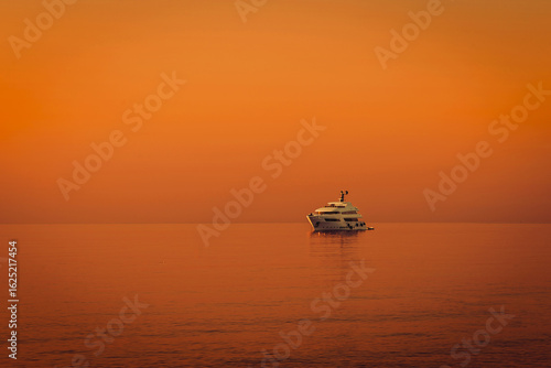 Luxury yacht floats on calm sea under deep orange sunset sky. Peaceful ocean scene perfect for travel promotions, luxury lifestyle, marine ads, or tropical vacation backgrounds.
