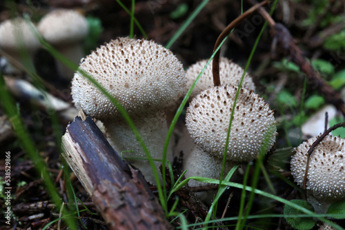 Lycoperdon perlatum, Close-up mushrooms in the autumn forest.